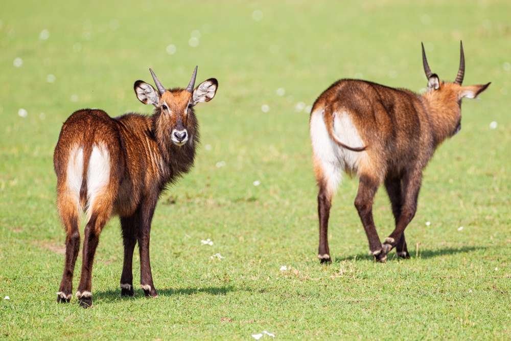 Crawsheys defassa waterbuck have a white spot or lump on their rump. Their coat is a long-haired, often shaggy brown-gray that emits a smelly, greasy secretion thought to be for waterproofing and its colour varies from brown to grey. They have ‘U’ shaped, long, spiral horns, present only on males and are curved backward, then forward 55 – 99 cm long
